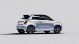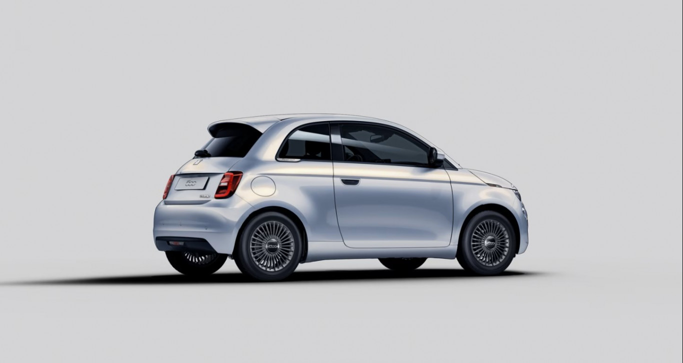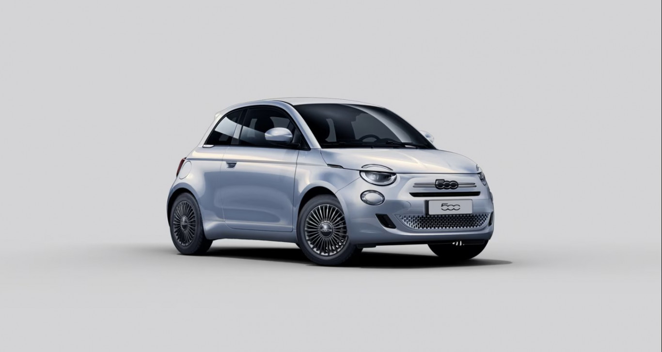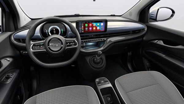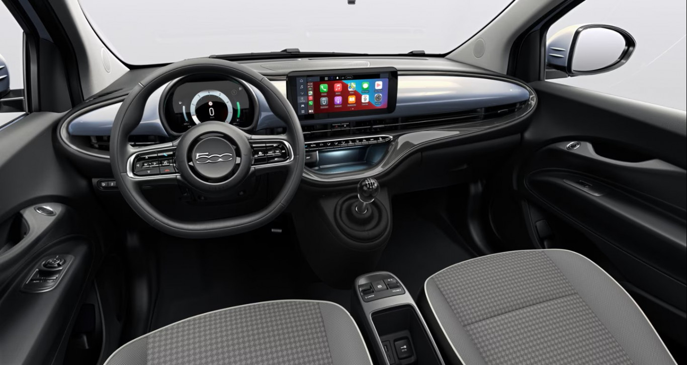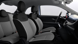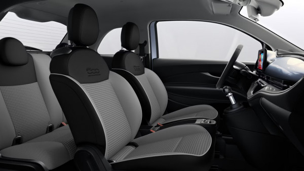 * Текстилна тапицерия с кариран мотив в сиво и черно, и релефно лого 500 и надпис „Fabbrica Italiana Automobili Torino“